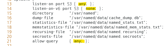 13번 listen-on port 53 { 127.0.0.1; }; 👉 listen-on port 53 { any; }; 로 변경