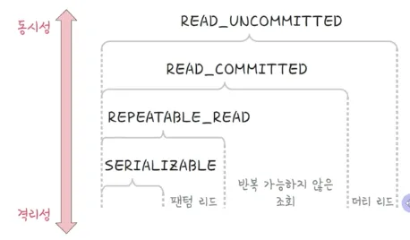 - 트랜잭션이 순차적으로 실행되면 격리성은 높아지지만 동시성은 낮아져 성능이 떨어짐 (격리성과 동시성은 반비례)