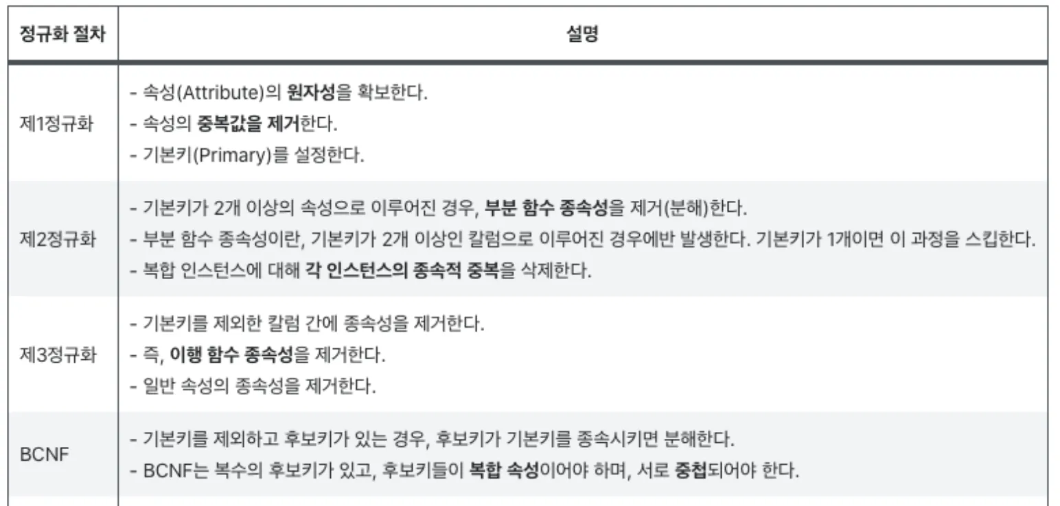 - 반정규화: 조인을 줄여 조회 성능을 높이고자 데이터 중복을 허용하는 것