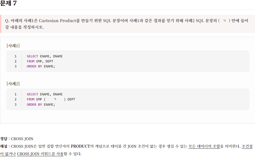 - From절에 2개 이상의 Table이 있을때 두 Table 사이에 유효 join 조건을 적지 않았을때 해당 테이블에 대한 모든 데이터를 전부 결합하여 Table에 존재하는 행 갯수를 곱한 만큼의 결과값이 반환되는 것이다.