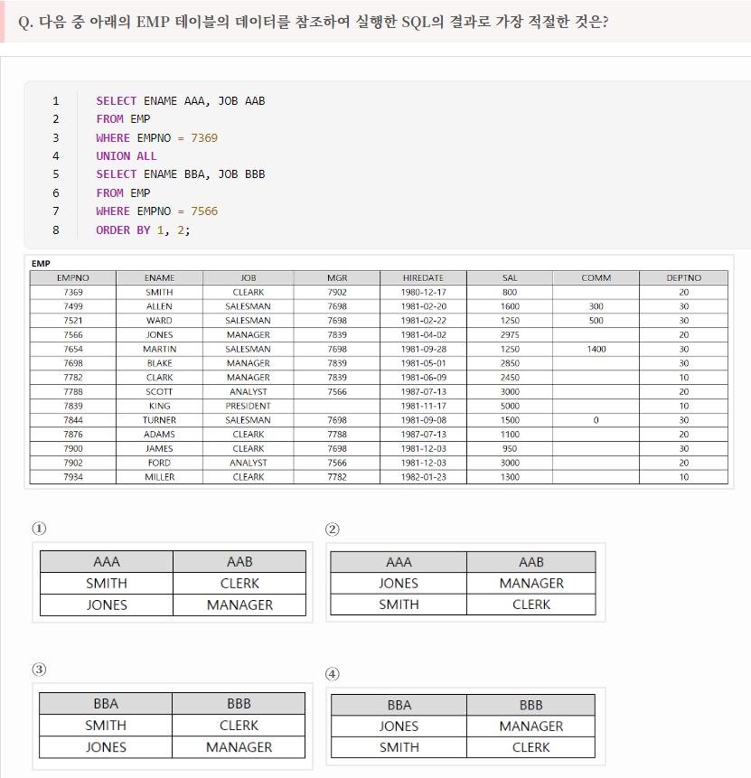 UNION ALL을 사용하는 경우 칼럼 ALIAS는 첫 번째 sql모듈 기준으로 표시되고 정렬 기준은 마지막 모듈에 표시한다!